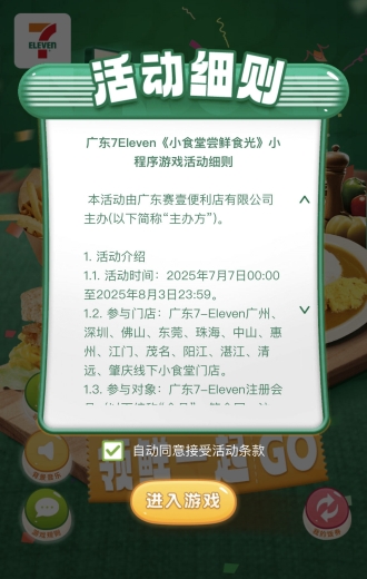 广东7-Eleven“小食堂尝鲜食光”小程序游戏,通过互动游戏赢取积分和优惠券,享受美食优惠。活动覆盖广深佛等多城市,参与简单,乐趣多多。