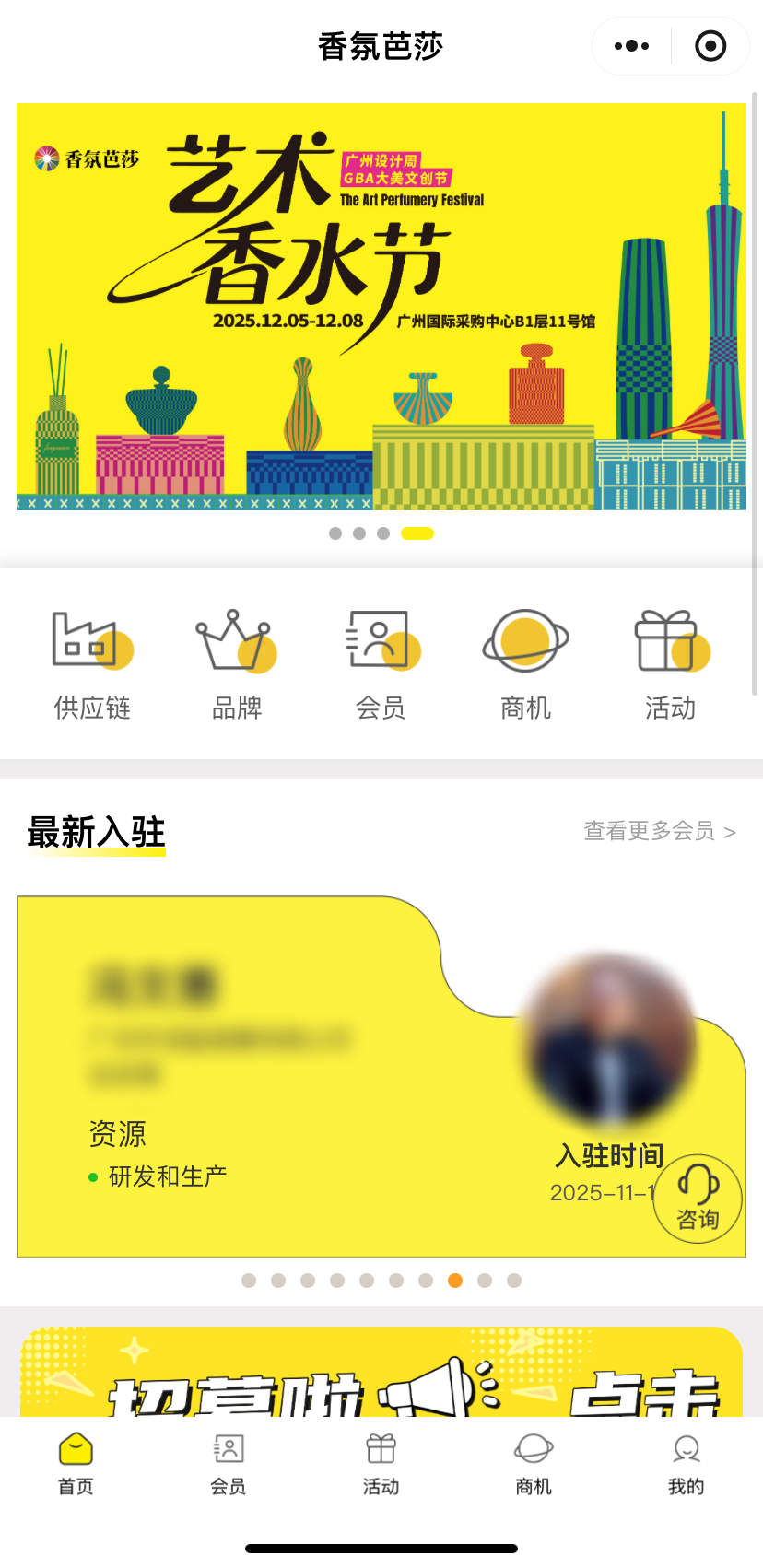 香氛行业垂直资源对接类 B2B 服务小程序,为香氛从业者提供供应链匹配、商机对接、会员入驻、行业活动报名等一站式服务,链接行业资源,赋能香氛产
