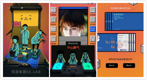 人脸识别类案例。进入案例,开始提示用户长按加载诊所,随后以故事的形式进入“诊所”,点击“开始勘探”会调用用户手机摄像头,用户自拍一张照片并选择使用,系统会自动开始识别用户的面部表情数据,并根据算法分析给出照片上的情绪状态。上传照片识别后的效果,也做成了游戏抽奖机的既视感,让人对识别结果充满了期待。最后用户可以选择重新测试,或进入下一步,填写收件信息获取复诊券。