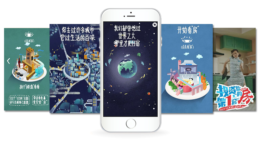 案例亮点:视频类,手绘漫画风格,背景采用清新鲜亮的色彩,点击立即体验,画风立刻变得小清新,以搞怪的创意视频展现了只许进行多次点击与视频自动播放就可让你快速寻找到风水宝地,教你买房注重点,视频结束出现老板电器产品宣传,继而跳转到结尾页,尾屏的动图也做得很有趣。可通过左右滑屏换个楼盘,点击接着看房。