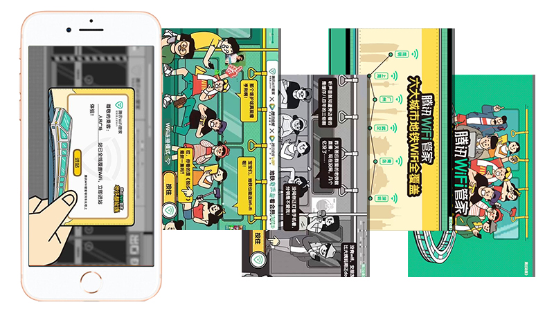 亮点:腾讯管家用来宣传地铁免费wifi,而推出的一款H5。运用长图页一镜到底的形式,通过长按让原本“灰色”乏味的地铁,变得鲜艳亮丽生动了起来。在“按”与“不按”之间,将地铁上人们形象在黑白色与彩色场景中的不同转换,细腻生动。完全展现。明暗对比下,显示WIFI之下,地铁生活的多姿多彩。从而达到宣传目的。
